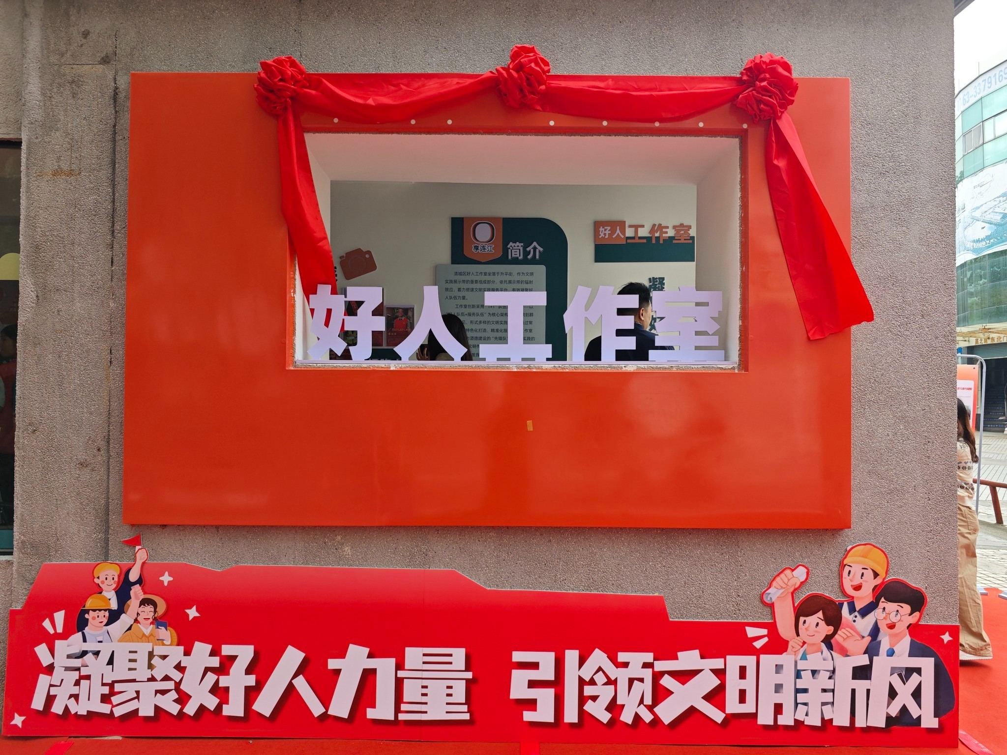 此次揭牌成立的“好人工作室”坐落于清城区升平街。透过红色的展示窗,一眼看见工作室简介以及定位——作为文明实践展示带的重要组成部分,依托展示带的辐射效应,着力搭建文明实践服务平台,有效凝聚好人队伍力量。